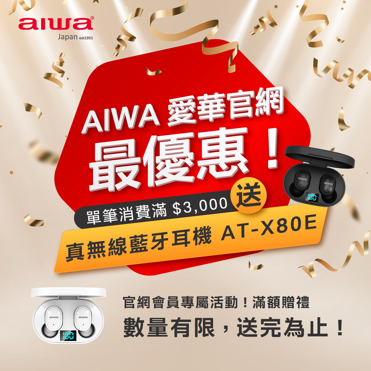 🤩別錯過這個絕佳機會,立即前往AIWA官網,滿額贈送AIWA 愛華藍牙耳機 AT-X80E!數量有限趕緊行動吧,享受高品質音樂體驗,盡在AIWA官網!