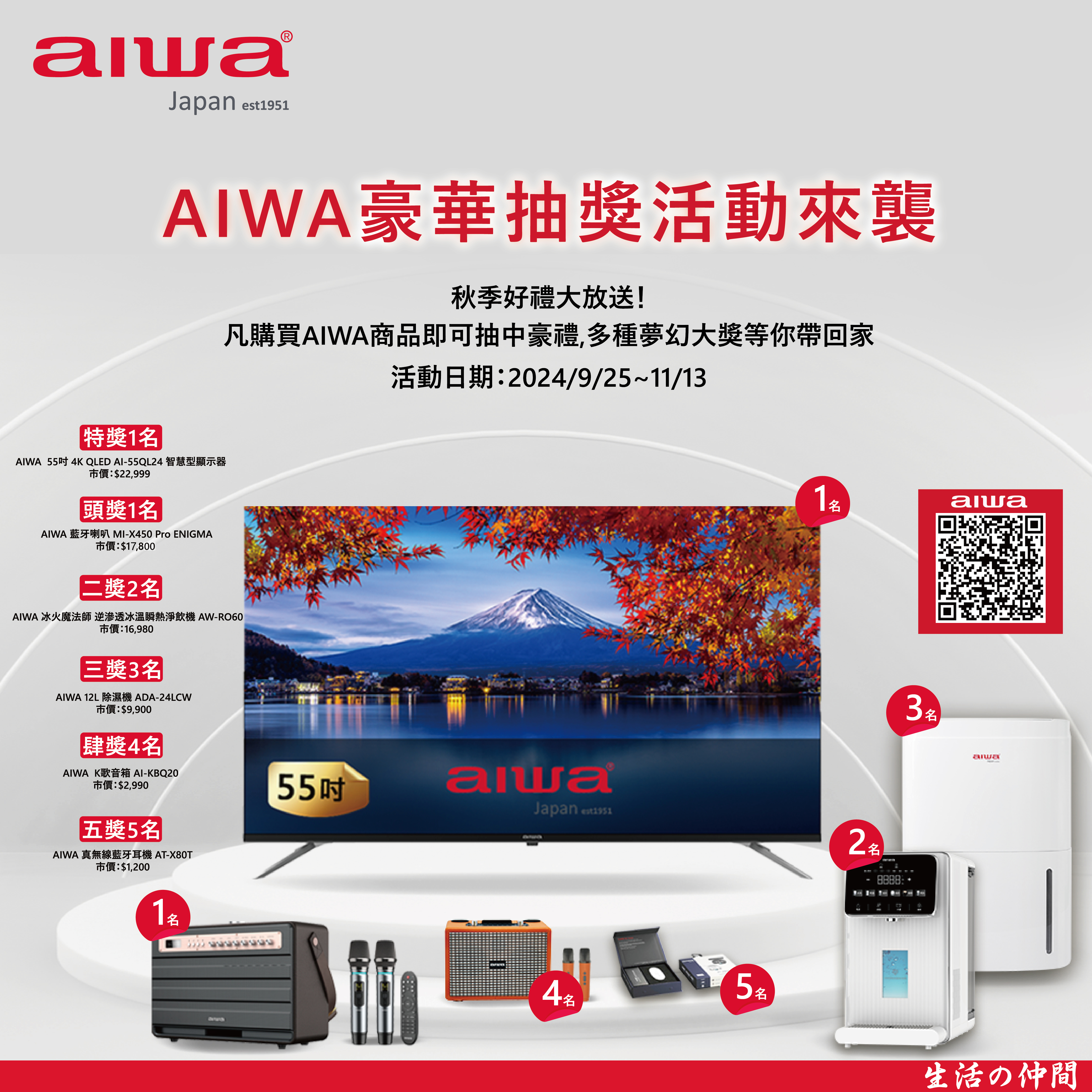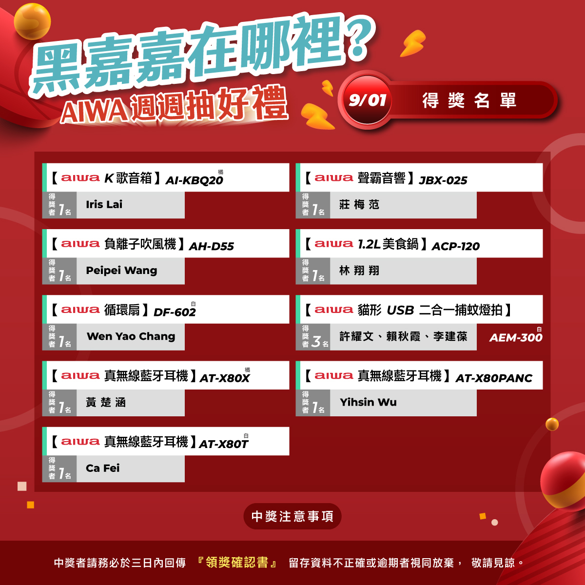 🎁 得獎公告:7/10~8/7,每週四公布3位中獎者於AIWA FB 粉絲專頁與官網!