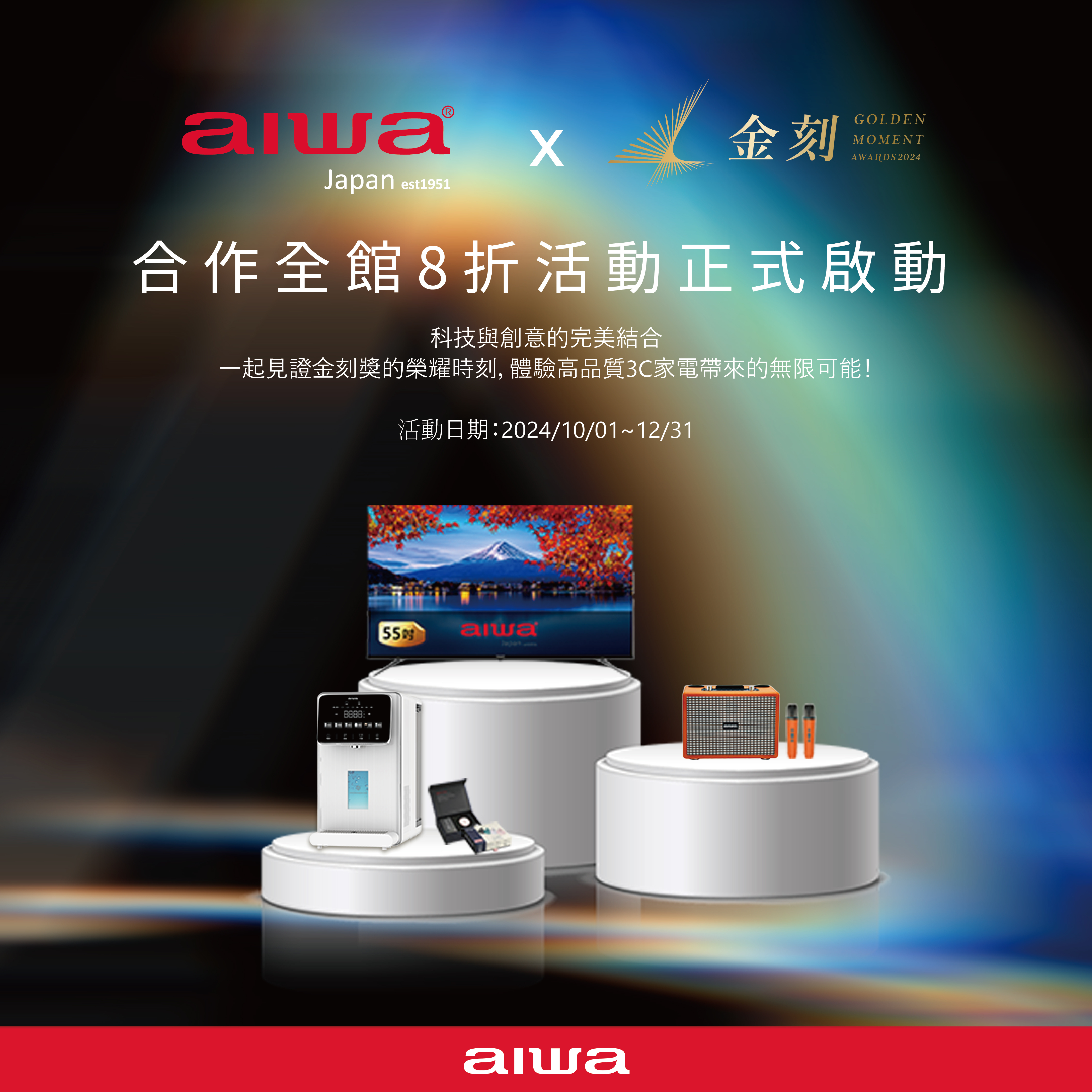 在金刻獎頒獎舞台,AIWA 愛華與創作者共同攜手合作,在創作者的巧思加持下,AIWA智慧3C家電完美融入日常,帶來演繹智慧生活的無限可能,為每一刻帶來驚喜與樂趣!呈現入圍作品的精采內容,讓每位觀眾身臨其境感受影像之美。我們同時推出限時優惠,讓大家也能在家中享受與創作者同步的極致視聽體驗!