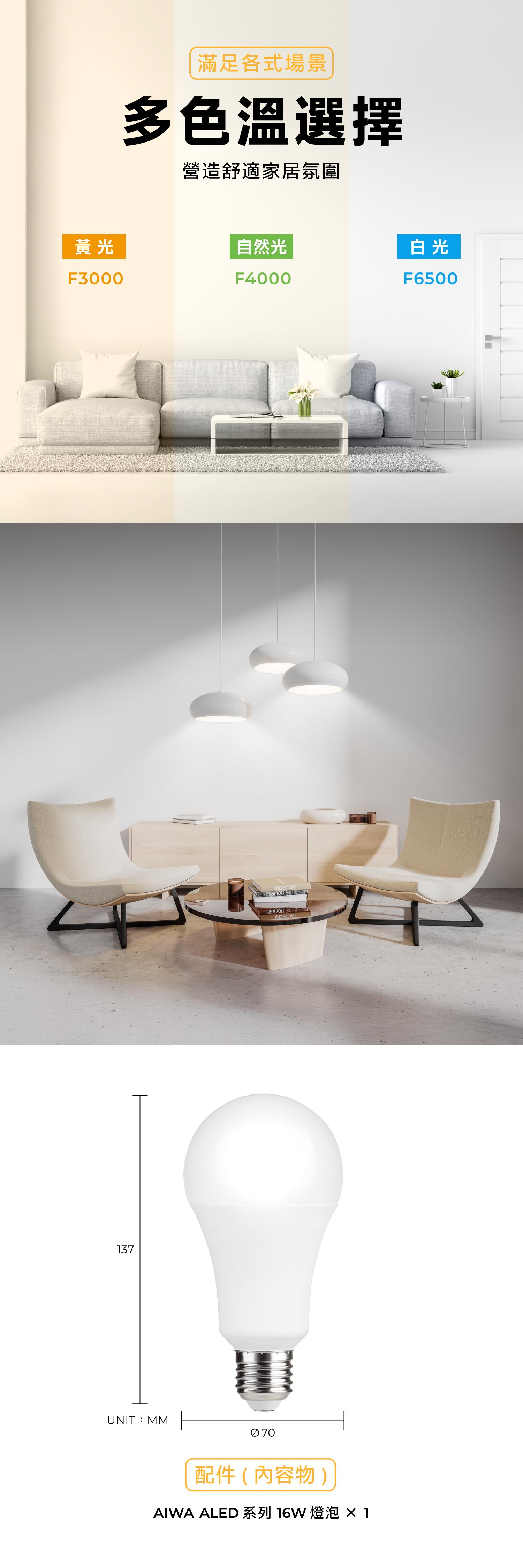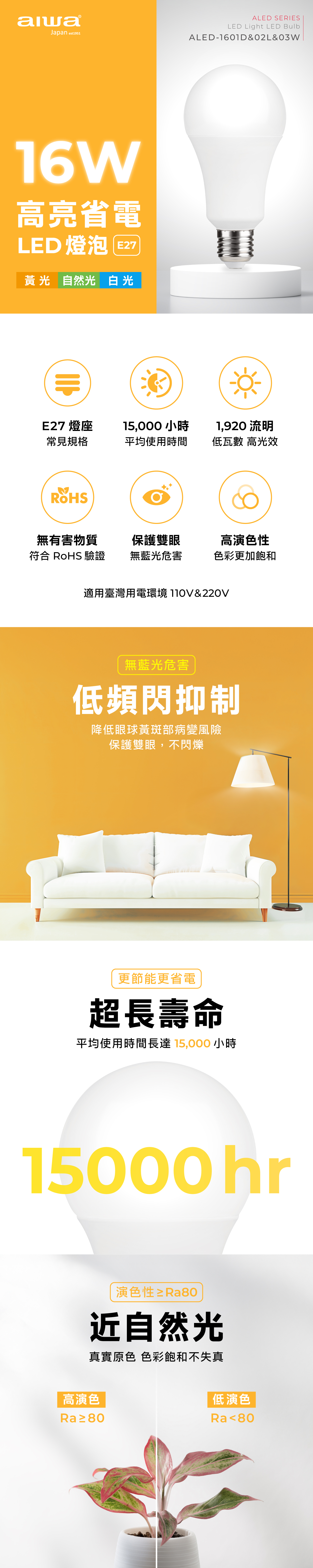 AIWA 愛華 16W LED燈泡 ALED-1601D/ALED-1602L/ALED-1603W